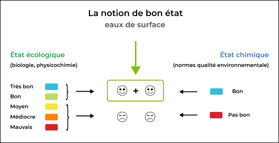 Les suivis ont permis d’acquérir de nombreuses données sur la biologie et la chimie. Les données concernant la biologie portent sur le phytoplancton, les macrophytes et le benthos de substrat meuble ainsi que la physico-chimie de l’eau qui constitue un paramètre de soutien à la biologie. Ils constituent les descripteurs de l’état écologique. L’état de la masse d’eau est donné par l’état du descripteur le plus dégradé. Les données concernant la chimie (contaminants métalliques et organiques prioritaires) proviennent de suivis réalisés dans le biote (cagging de moules sur la base de la méthodologie RINBIO) et dans l’eau (échantillonneurs passifs intégratifs). Les valeurs de chaque substance prioritaire sont comparées aux Normes de Qualité Environnementales (NQE) pour établir l’état chimique. Une masse d’eau est considérée en bon état chimique lorsqu’aucune concentration d’un polluant prioritaire ne dépasse sa NQE.